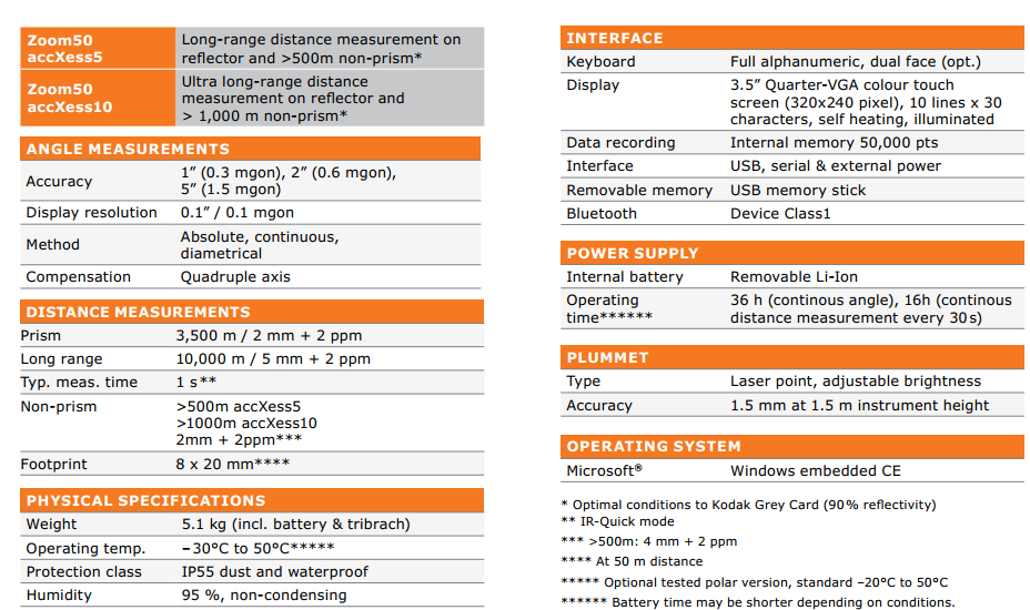 Со докажаната accXess технологија, интелигентен мотор за мерење на далечина дизајниран за извонреден опсег, брзина и најголема точност дури и во тешки услови, Zoom50 претставува врв на технологијата кај мануелните тотални станици .