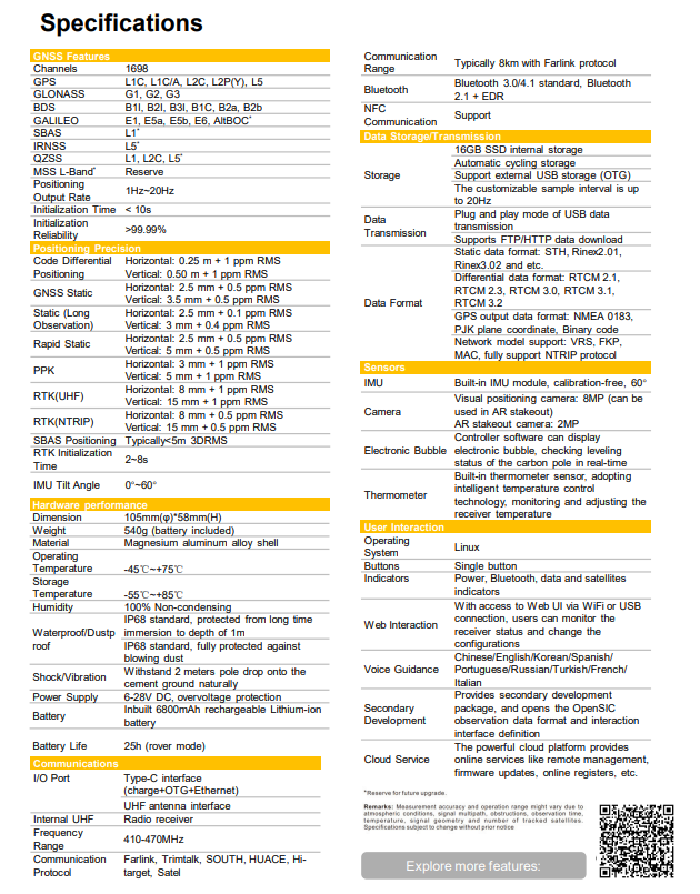 Додадено на тоа е и револуционерното решение со пета генерација на IMU сензорот кој овозможува снимање на точки под агол од 60O, функција која ве ослободува од обврската за гледање во либелата и значително ја убрзува работата. Истотака збогатен со AR визуелно исколчување на точки и визуелно снимање на точки, овозможено од две камери.